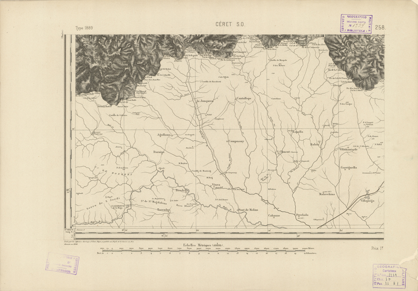 "Paris. - Service Géograèhique de l'Armée, 1889. Ebbe origine dall'Edizione zincografica in quarti di foglio, stabilita fino dal 1879, per la Carta detta de "L'etat-Major". Infatti non rispondendo più il sistema della riproduzione zincografica alle esigenze che la revisione dei fogli imponeva per un inevitabile logoramento dei rami originali, fu proposta dapprima la correzione degli zinchi, ma questo, importando un lavoro lungo e gravoso, si adottò il procedimento galvanico. I rami galvanici ottenuti e corretti secondo questo sistema presero il nome di "édition type 1889". Allo scopo di facilitare l'incisione fu adoperata la suddivisione in quarti di foglio come per l'edizione zincografica. la revisione dei fogli di questo tipo nnn fu iniziata che nel 1893. Dal catalogo del S.G.A. risultano mancanti a questa edizione i dipartimenti della "Moselle", del "Bas-Rhin" e del "Haut-Rhin" per le quali non esiste che una edizione in fogli interi aggiornata nel 1901."