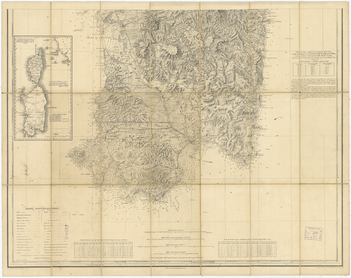 "Dedicata alla Maestà del Re Carlo Alberto Primo dal suo umilissimo e devotissimo suddito il Maggior Generale C.te Alberto Ferrero della Marmora, Comandante la Regia scuola di marina di Genova, Membro della R. Accademia delle Scienze di Torino già Colonnello -ajutante -Generale nel R. Corpo di Stato Maggiore Generale, assistito dal suo collaboratore * il cav. D. Carlo de Candia Maggiore nel R. Corpo suddetto. Incisa da Debuissons, Strada des bernardins, 24. Scritta da Arnoul impiegato al deposito della Guerra, addetto alla Carta di Francia_ Ibid. Paris e Torino, 1845. *Sui lavori trigonometrici e geodetici di questa carta incominciati nel 1824, e proseguiti quasi senza interruzioni sino al 1838, vedasi la notice inserita nel 1°vol 2 da Ediz (1839) del Voyage en sardaigne del medesimo autore. Parigi, presso Arthus Bertrand, strada Montefeuille, 23: e Chamerot, strada du jardinet, 13. Questa edizione del 1894, deriva della carta del 1845 con l'aggiornamento della sola rete ferroviaria, come riportato nel margine inferiore, fuori quadro. La carta presenta aggiunte manoscritte sia a china che a matita colorata. Nel foglio: - Un riquadro con la "carta dimostrativa della riunione dei triangoli della Sardegna con quelli del Continente, passando per quei di Corsica", -in basso a sinistra la leggenda con i segni convenzionali e la Tavola di riduzione (per gli Scandagli) dei piedi parigini in Braccie ed in Metri, - in basso al centro quattro scale grafiche e numeriche, e l'avvertenza che " l'autore intende godere della Proprietà di questa carta, guarentita dalle Leggi e dai Trattati", -in basso a destra la Tavola di riduzione (per le Altitudini) dei metri in piedi Parigini, Pollici e Linee. - in alto a destra le informazioni sulla proiezione utilizzata e una tabella con i valori degli archi di longitudine e latitudine compresi nei fogli. Poi una lunga nota avverte sulle fonti utilizzate per la compilazione della carta."