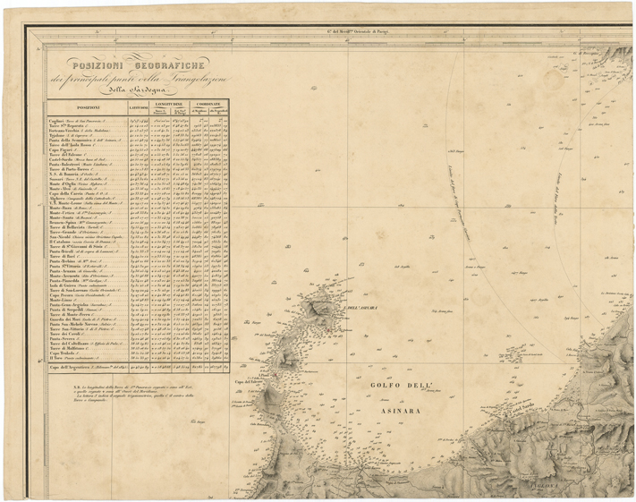 "Dedicata alla Maestà del Re Carlo Alberto Primo dal suo umilissimo e devotissimo suddito il Maggior Generale C.te Alberto Ferrero della Marmora, Comandante la Regia scuola di marina di Genova, Membro della R. Accademia delle Scienze di Torino già Colonnello -ajutante -Generale nel R. Corpo di Stato Maggiore Generale, assistito dal suo collaboratore * il cav. D. Carlo de Candia Maggiore nel R. Corpo suddetto. Incisa da Debuissons, Strada des bernardins, 24. Scritta da Arnoul impiegato al deposito della Guerra, addetto alla Carta di Francia_ Ibid. Paris e Torino, 1845. *Sui lavori trigonometrici e geodetici di questa carta incominciati nel 1824, e proseguiti quasi senza interruzioni sino al 1838, vedasi la notice inserita nel 1°vol 2 da Ediz (1839) del Voyage en sardaigne del medesimo autore. Parigi, presso Arthus Bertrand, strada Montefeuille, 23: e Chamerot, strada du jardinet, 13. La carta è in otto fogli sciolti conservati con tela. "