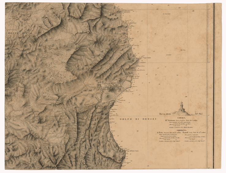"Dedicata alla Maestà del Re Carlo Alberto Primo dal suo umilissimo e devotissimo suddito il Maggior Generale C.te Alberto Ferrero della Marmora, Comandante la Regia scuola di marina di Genova, Membro della R. Accademia delle Scienze di Torino già Colonnello -ajutante -Generale nel R. Corpo di Stato Maggiore Generale, assistito dal suo collaboratore * il cav. D. Carlo de Candia Maggiore nel R. Corpo suddetto. Incisa da Debuissons, Strada des bernardins, 24. Scritta da Arnoul impiegato al deposito della Guerra, addetto alla Carta di Francia_ Ibid. Paris e Torino, 1845. *Sui lavori trigonometrici e geodetici di questa carta incominciati nel 1824, e proseguiti quasi senza interruzioni sino al 1838, vedasi la notice inserita nel 1°vol 2 da Ediz (1839) del Voyage en sardaigne del medesimo autore. Parigi, presso Arthus Bertrand, strada Montefeuille, 23: e Chamerot, strada du jardinet, 13. La carta è in otto fogli sciolti conservati con tela."