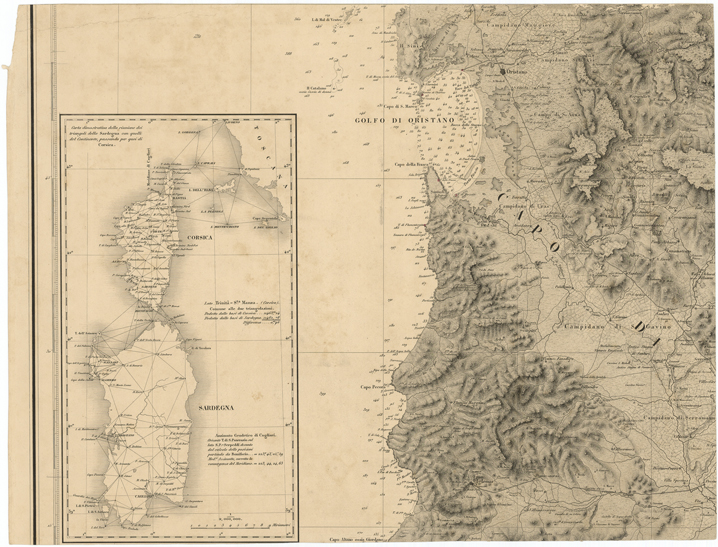 "Dedicata alla Maestà del Re Carlo Alberto Primo dal suo umilissimo e devotissimo suddito il Maggior Generale C.te Alberto Ferrero della Marmora, Comandante la Regia scuola di marina di Genova, Membro della R. Accademia delle Scienze di Torino già Colonnello -ajutante -Generale nel R. Corpo di Stato Maggiore Generale, assistito dal suo collaboratore * il cav. D. Carlo de Candia Maggiore nel R. Corpo suddetto. Incisa da Debuissons, Strada des bernardins, 24. Scritta da Arnoul impiegato al deposito della Guerra, addetto alla Carta di Francia_ Ibid. Paris e Torino, 1845. *Sui lavori trigonometrici e geodetici di questa carta incominciati nel 1824, e proseguiti quasi senza interruzioni sino al 1838, vedasi la notice inserita nel 1°vol 2 da Ediz (1839) del Voyage en sardaigne del medesimo autore. Parigi, presso Arthus Bertrand, strada Montefeuille, 23: e Chamerot, strada du jardinet, 13. La carta è in otto fogli sciolti conservati con tela."