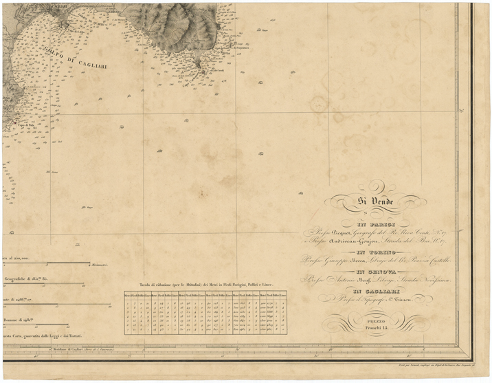 "Dedicata alla Maestà del Re Carlo Alberto Primo dal suo umilissimo e devotissimo suddito il Maggior Generale C.te Alberto Ferrero della Marmora, Comandante la Regia scuola di marina di Genova, Membro della R. Accademia delle Scienze di Torino già Colonnello -ajutante -Generale nel R. Corpo di Stato Maggiore Generale, assistito dal suo collaboratore * il cav. D. Carlo de Candia Maggiore nel R. Corpo suddetto. Incisa da Debuissons, Strada des bernardins, 24. Scritta da Arnoul impiegato al deposito della Guerra, addetto alla Carta di Francia_ Ibid. Paris e Torino, 1845. *Sui lavori trigonometrici e geodetici di questa carta incominciati nel 1824, e proseguiti quasi senza interruzioni sino al 1838, vedasi la notice inserita nel 1°vol 2 da Ediz (1839) del Voyage en sardaigne del medesimo autore. Parigi, presso Arthus Bertrand, strada Montefeuille, 23: e Chamerot, strada du jardinet, 13. La carta è in otto fogli sciolti conservati con tela."