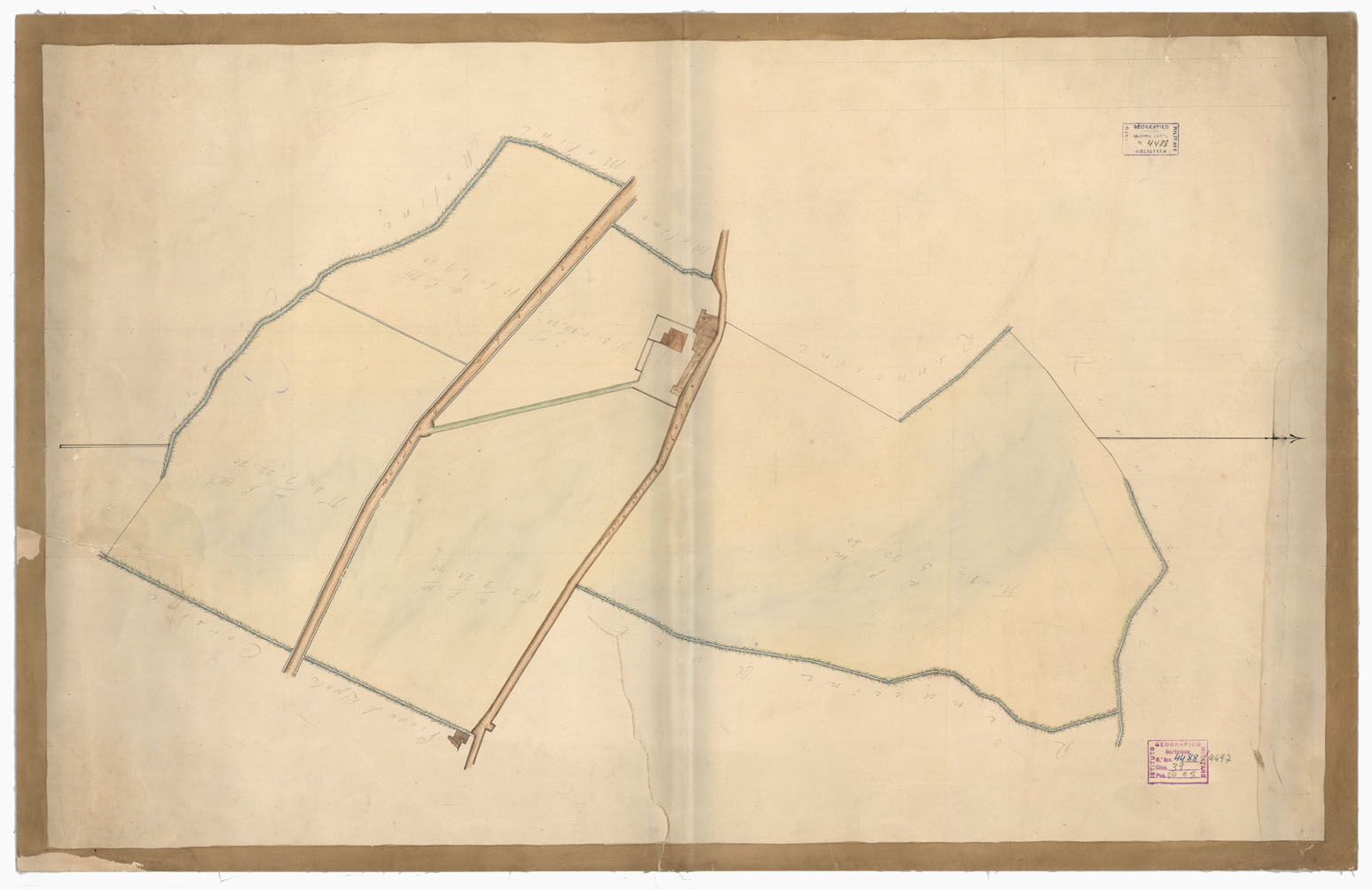"Planimetria di un fabbricato con individuazione dell'intera proprietà e dei nominativi delle proprietà circostanti. Disegno a china con coloriture in acquerello realizzato su carta montata su cartone. Copia ridotta è al n. 4497 di inventario"