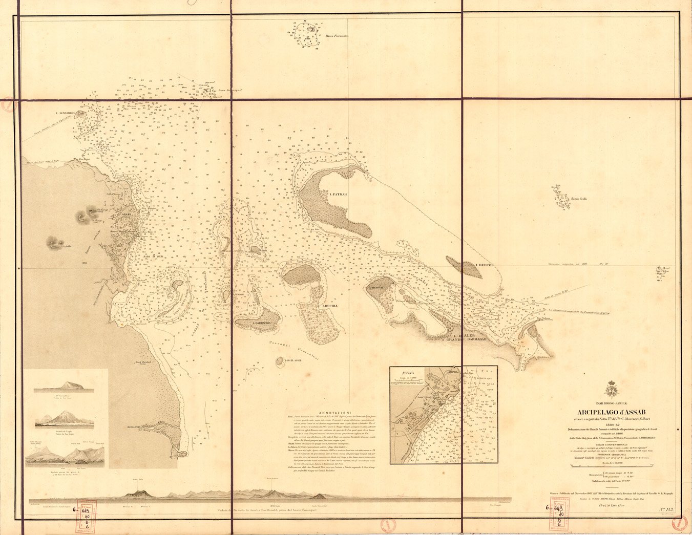 "Rilievi eseguiti dai Sotto T.ti di V.llo C. Marcacci, G. Boet 1880-82. Determinazione dei Banchi foranei e rettifiche alla posizione geografica di Assab eseguite nel 1886 dallo Stato Maggiore della R. Cannoniera Scilla, Comandante C. Mirabello."