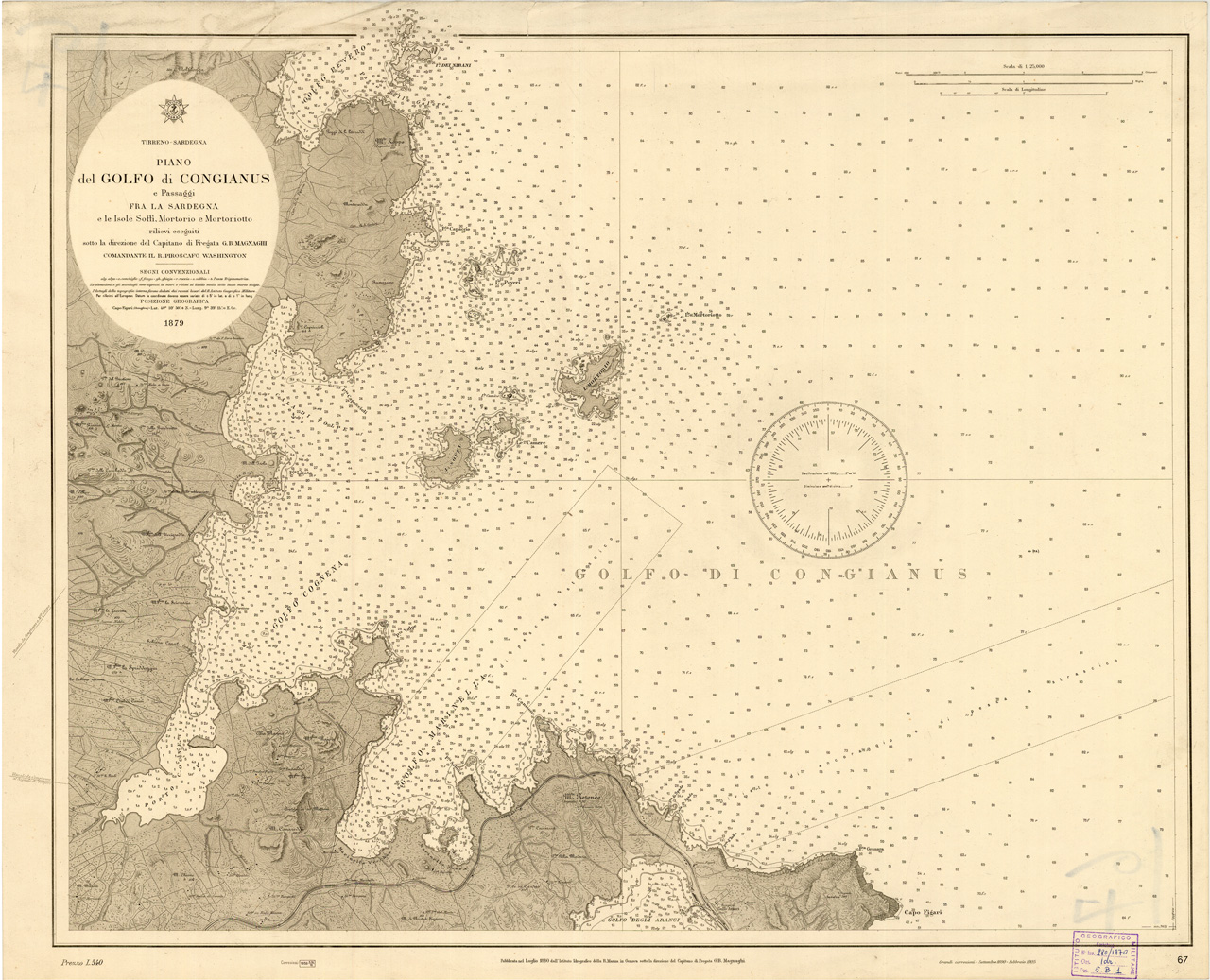"Rilievi eseguiti sotto la direzione del Capitano di Fregata G.B. Magnaghi. Comandante il R. piroscafo Washington 1879. Pubblicata nel Luglio 1880 dall'Istituto Idrografico della R. Marina in Genova sotto la direzione del capitano di fregata G.B Magnaghi. Grandi correzioni - Settembre 1890-Febbraio 1905"