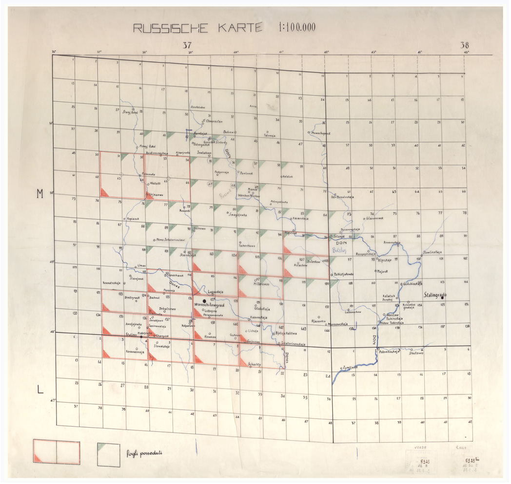 "Autore Stato maggiore dell'Armata Rossa - Riproduzione del Servizio Cartografico dello S.M. Tedesco- Berlino Fogli 49 Tipo di stampa in bistro con boschi ed acque - rappresentazione orografica a curve di livello grafica russa e tedesca. "