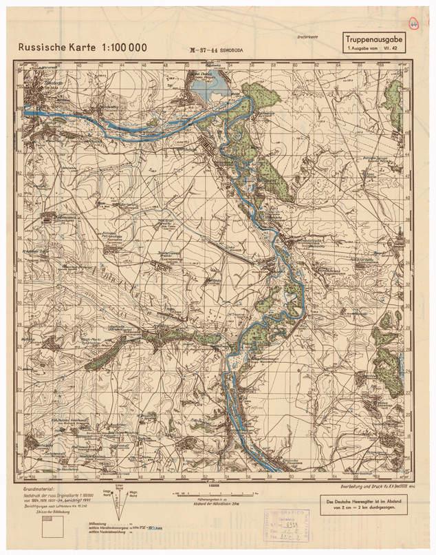 "Autore Stato maggiore dell'Armata Rossa - Riproduzione del Servizio Cartografico dello S.M. Tedesco- Berlino Fogli 49 Tipo di stampa in bistro con boschi ed acque - rappresentazione orografica a curve di livello grafica russa e tedesca."