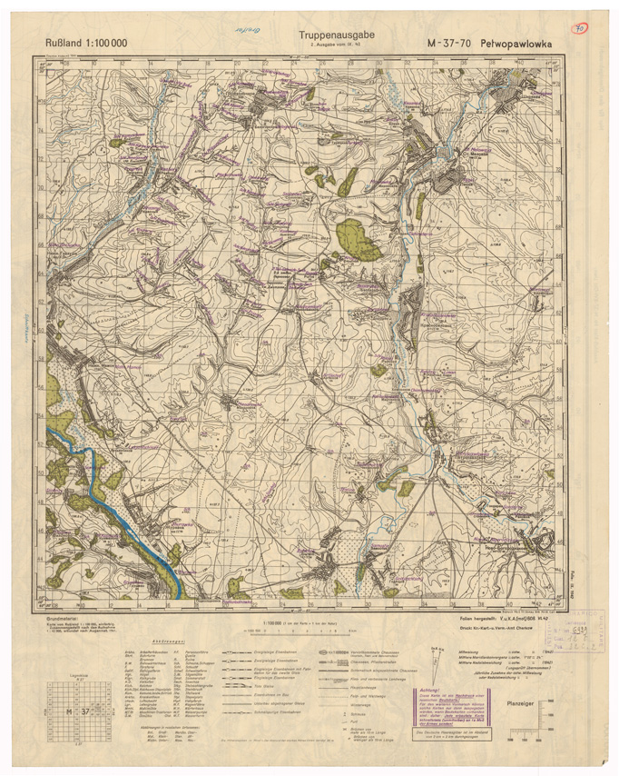 "Autore Stato maggiore dell'Armata Rossa - Riproduzione del Servizio Cartografico dello S.M.Tedesco- Berlino Fogli 49 Tipo di stampa in bistro con boschi ed acque - rappresentazione orografica a curve di livello grafica russa e tedesca."