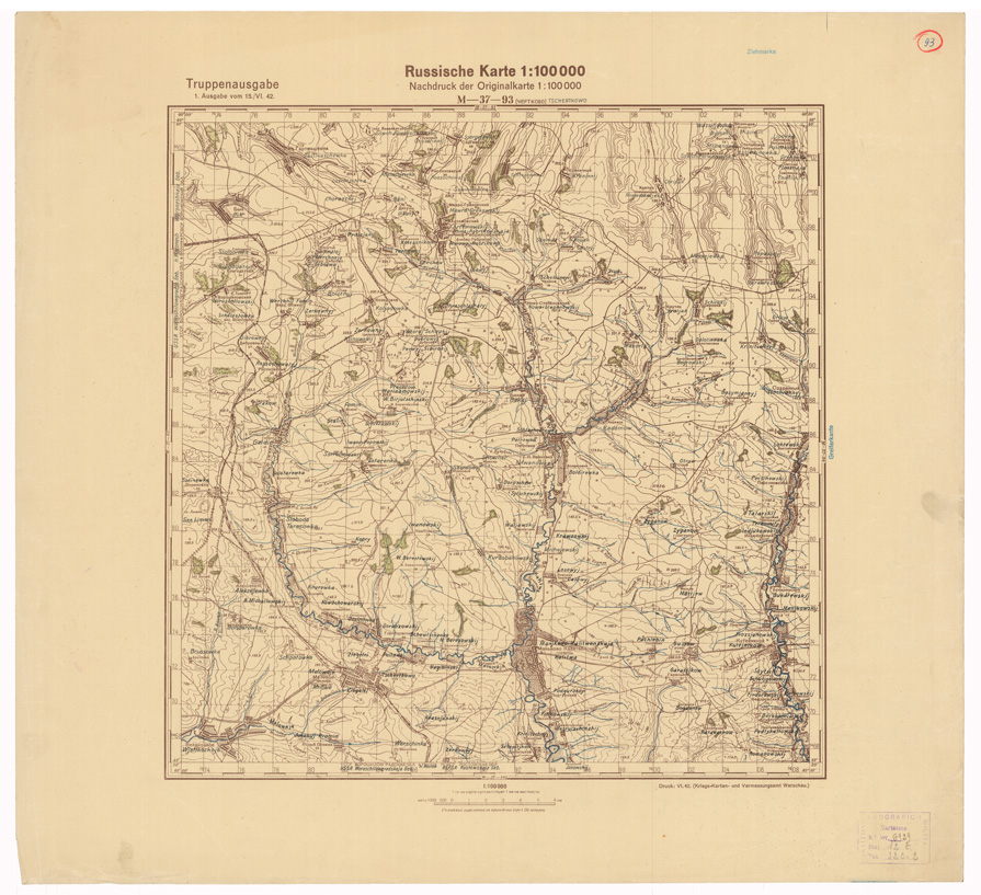 "Autore Stato maggiore dell'Armata Rossa - Riproduzione del Servizio Cartografico dello S.M.Tedesco- Berlino. Fogli 49 Tipo di stampa in bistro con boschi ed acque - rappresentazione orografica a curve di livello grafica russa e tedesca. "