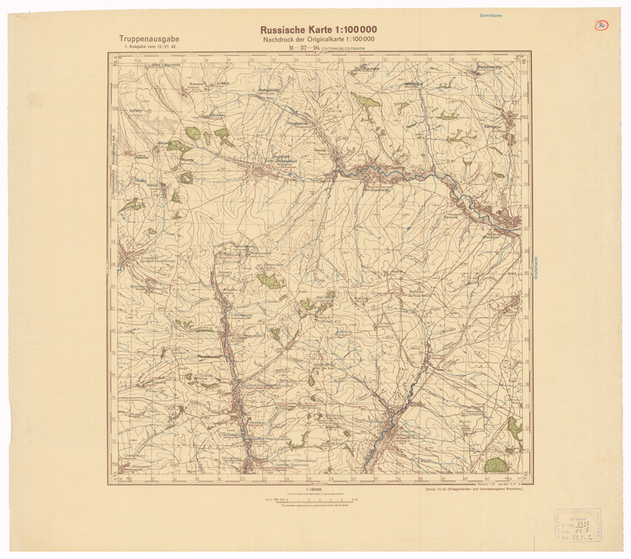 "Autore Stato maggiore dell'Armata Rossa - Riproduzione del Servizio Cartografico dello S.M.Tedesco- Berlino. Fogli 49 Tipo di stampa in bistro con boschi ed acque - rappresentazione orografica a curve di livello grafica russa e tedesca."