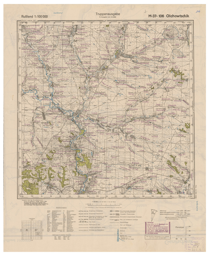 "FoglioAutore Stato maggiore dell'Armata Rossa - Riproduzione del Servizio Cartografico dello S.M.Tedesco- Berlino. Fogli 49 Tipo di stampa in bistro con boschi ed acque - rappresentazione orografica a curve di livello grafica russa e tedesca."