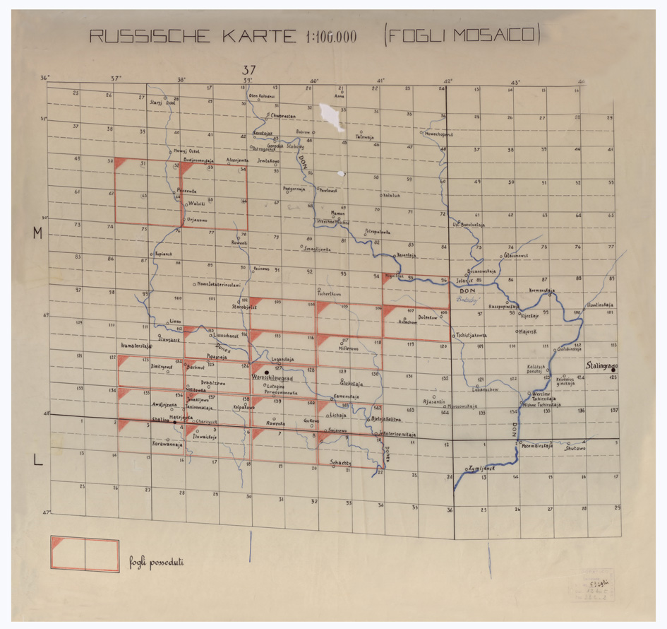 "Autore Stato maggiore dell'Armata Rossa - Riproduzione del Servizio Cartografico dello S.M. Tedesco- Berlino. Fogli 21 - Tipo di stampa in bistro con boschi ed acque - rappresentazione orografica a curve di livello grafica russa e tedesca."