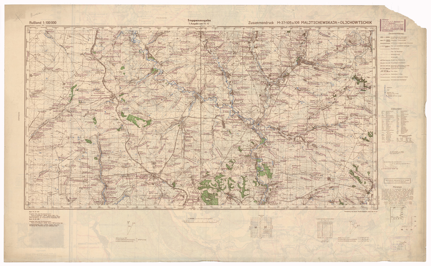 RUSSIA - RUSSISCHE KARTE (RIPRODUZIONE TEDESCA DELLA CARTA ORIGINALE DELLO S.M. DELL'ESERCITO ROSSO) Foglio M-37-105 Maljtschewskaja, Foglio M-37-106 Oljchowtschik