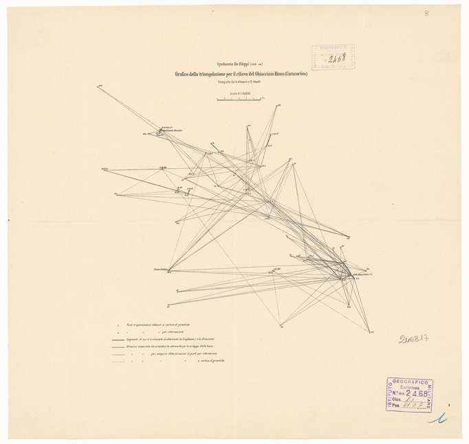 INDIA BRITANNICA - SPEDIZIONE DE FILIPPI NELL'HIMALAIA - GRAFICO DELLA TRIANGOLAZIONE PER IL RILIEVO DEL GHIACCIAIO RIMU' - Caracorum
