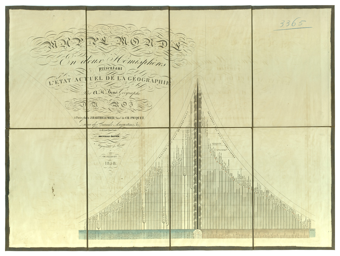 "Mappamondo (senza scala) Autore: Geogr. A.H. Brue Fogli 2 + 1 (tav) Incisa su rame in nero ed acquerellata a mano Inv. SBN 7-5244"