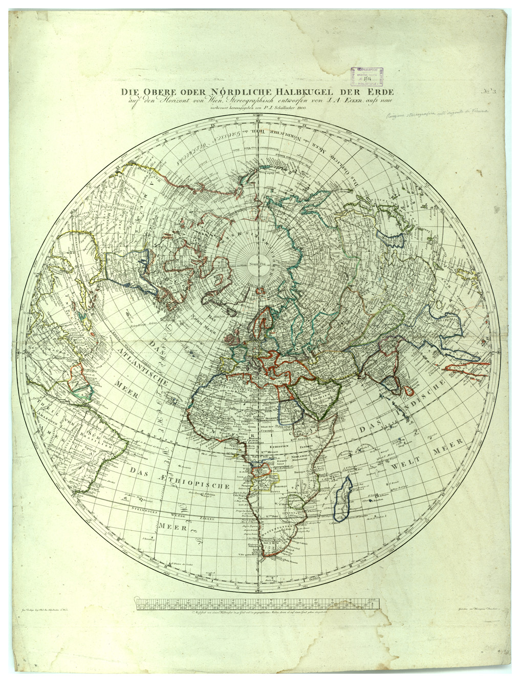 " Die Obere oder Nordliche Halbkugel der erde auf den horizont von wien stereographisch entworfen (senza scala) Autore: P.J. Schalbacher Stampa in nero acquerellata a mano Rappr.Orogr. A monticelli Inv. SBN 7-3714"