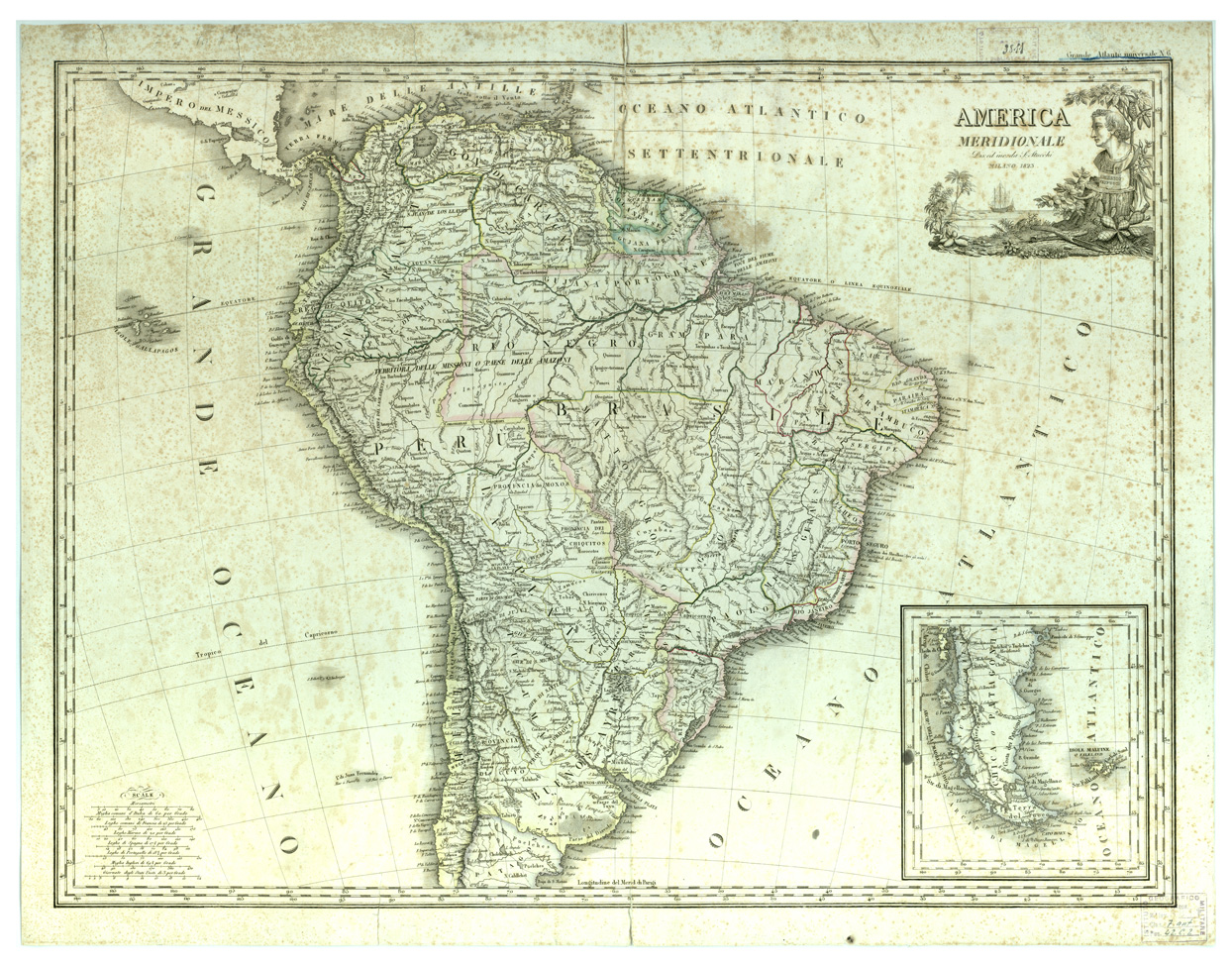 "AMERICA-CARTE GENERALI Autore: Stucchi Incisione su rame (colorata a mano) Rappr. Orogr. A tratteggio Inv. SBN 7-3811"