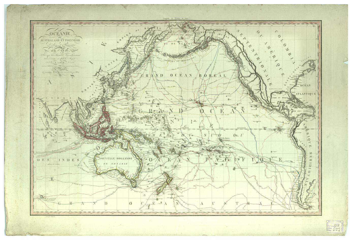 "OCEANIA-CARTE GENERALI (senza scala) Autore: Lapie Incisione – Coloritura a mano Rappr. Orogr. Dimostrativa Inv. SBN 7-5838 "