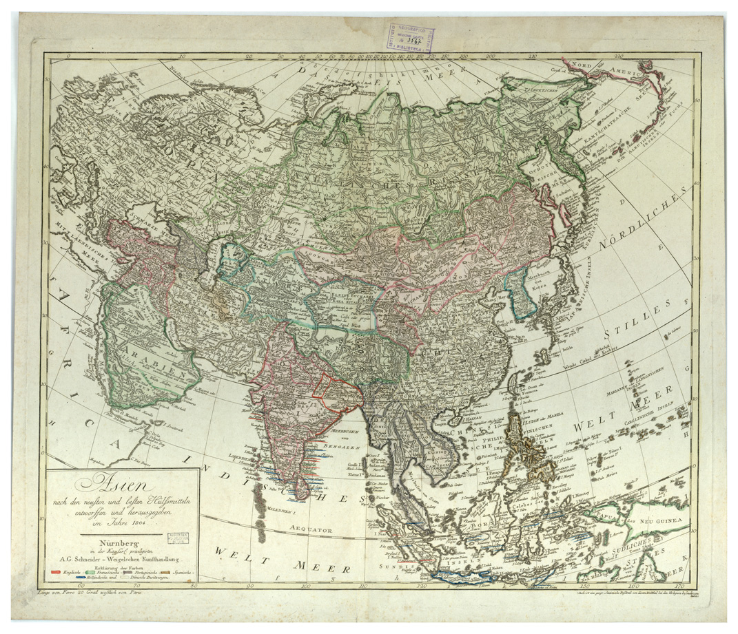 "ASIA-CARTE GENERALI (senza scala) Autore: Schneider Incisione su rame colorato a mano Rappr. Orogr. A tratteggio Inv. SBN 7-3567"