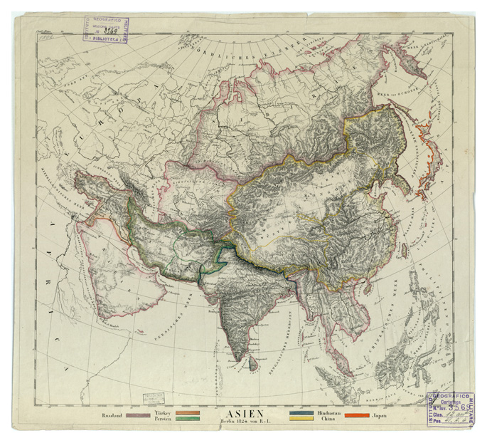 "ASIA-CARTE GENERALI (senza scala) Autore: Von R.V.L. Stampa in nero colorata a mano Rappr. Orogr. A sfumo Inv. SBN 7-3569"