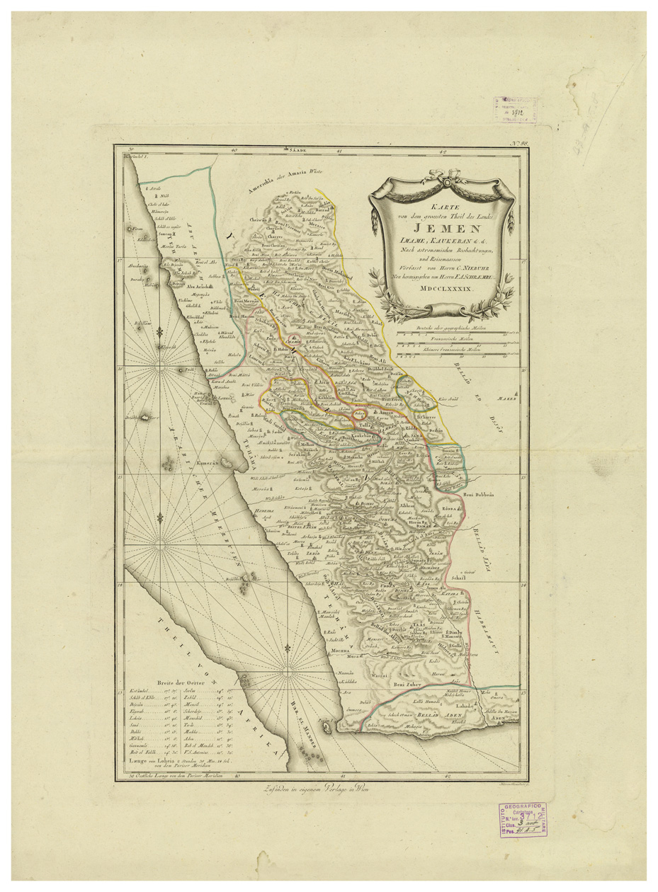 "Autore Hernn. C. Niebuhr Incisione su rame. Rappresentazione Orografica a tratteggio. Inventario SBN 7-3712 "