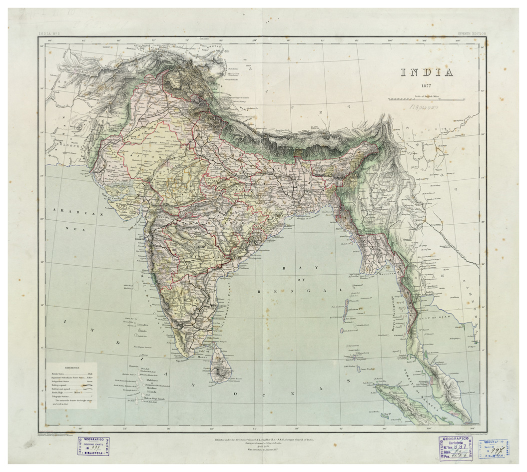 "Autore Survey of India Fogli 1 incisione su rame colorata a mano. Rappresentazione Orografica tratteggio. Inventario SBN 7-997"