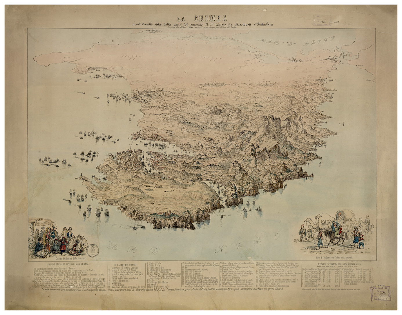 "RUSSIA – CARTE SPECIALI (senza scala) Autore carlo Bossoli Fogli 1 (montato su tela) stampa a colori Rappresentazione Orografica prospettica. Inventario SBN 7-4432"