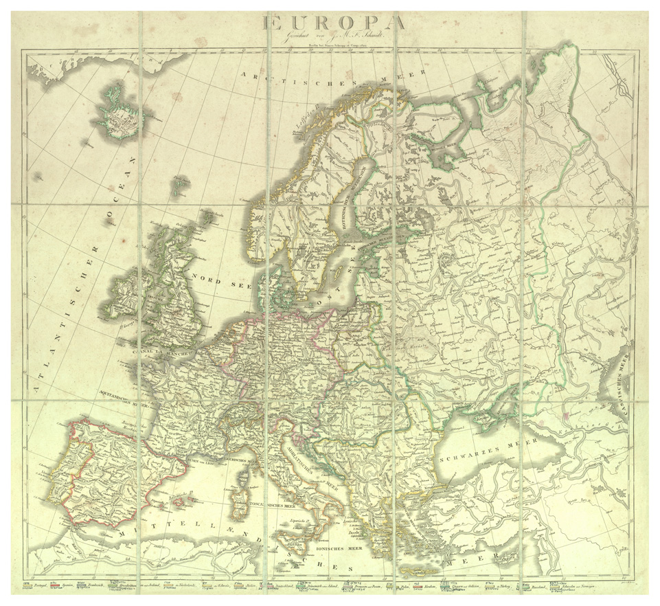"EUROPA - CARTE GENERALI (vedi anche inv. 3502) Autore F. Schmidt Fogli 1 (su tela a stacchi) incisione su rame in nero rappresentazione orografica a tratteggio. Inventario SBN 7-17412"