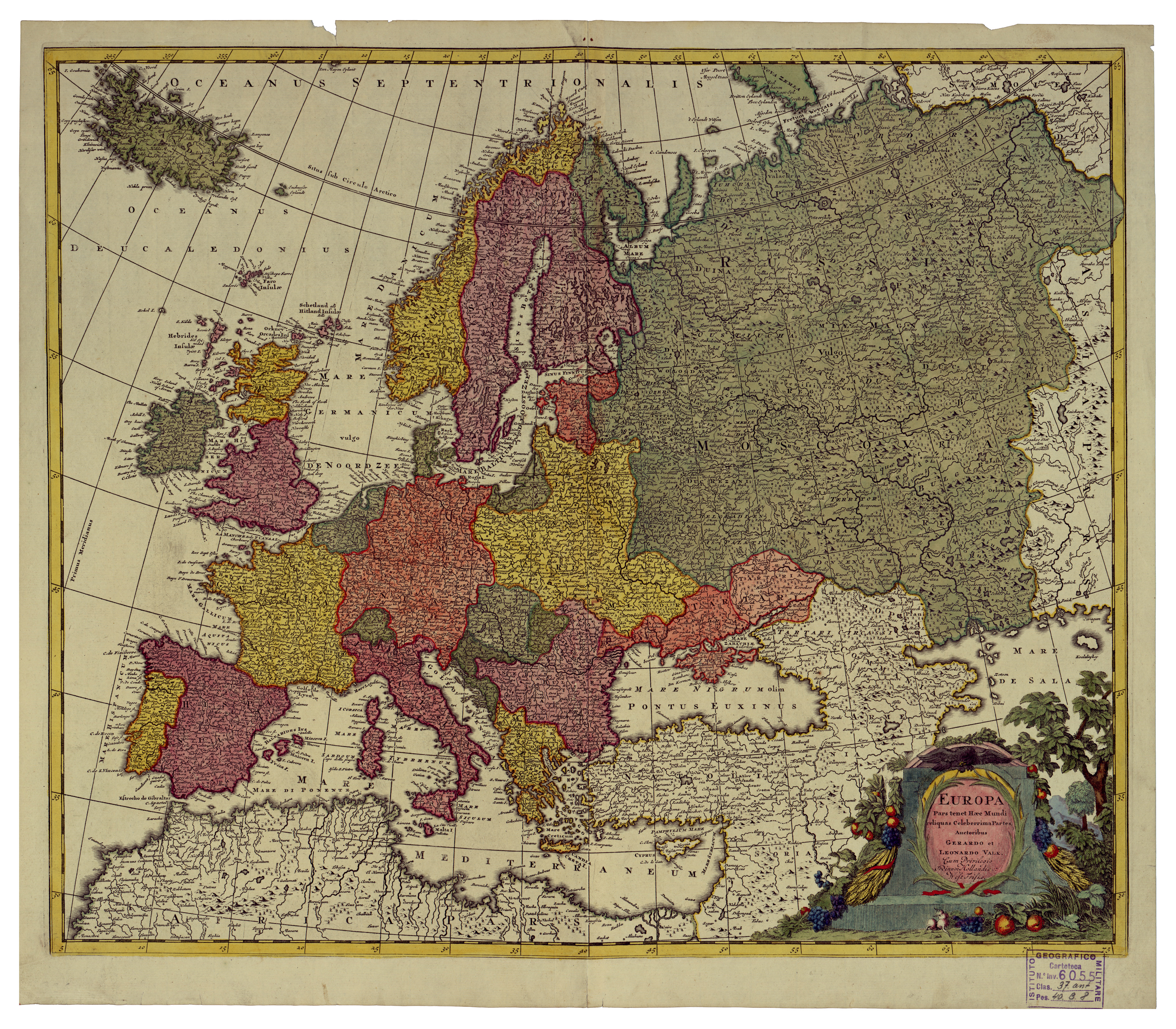 "EUROPA - CARTE GENERALI (senza scala, senza data Edizione) Autore Gerardo et Leonardo Valk Fogli 1 incisione colorita a mano rappresentazione orografica prospettica. Inventario SBN 7-6055"