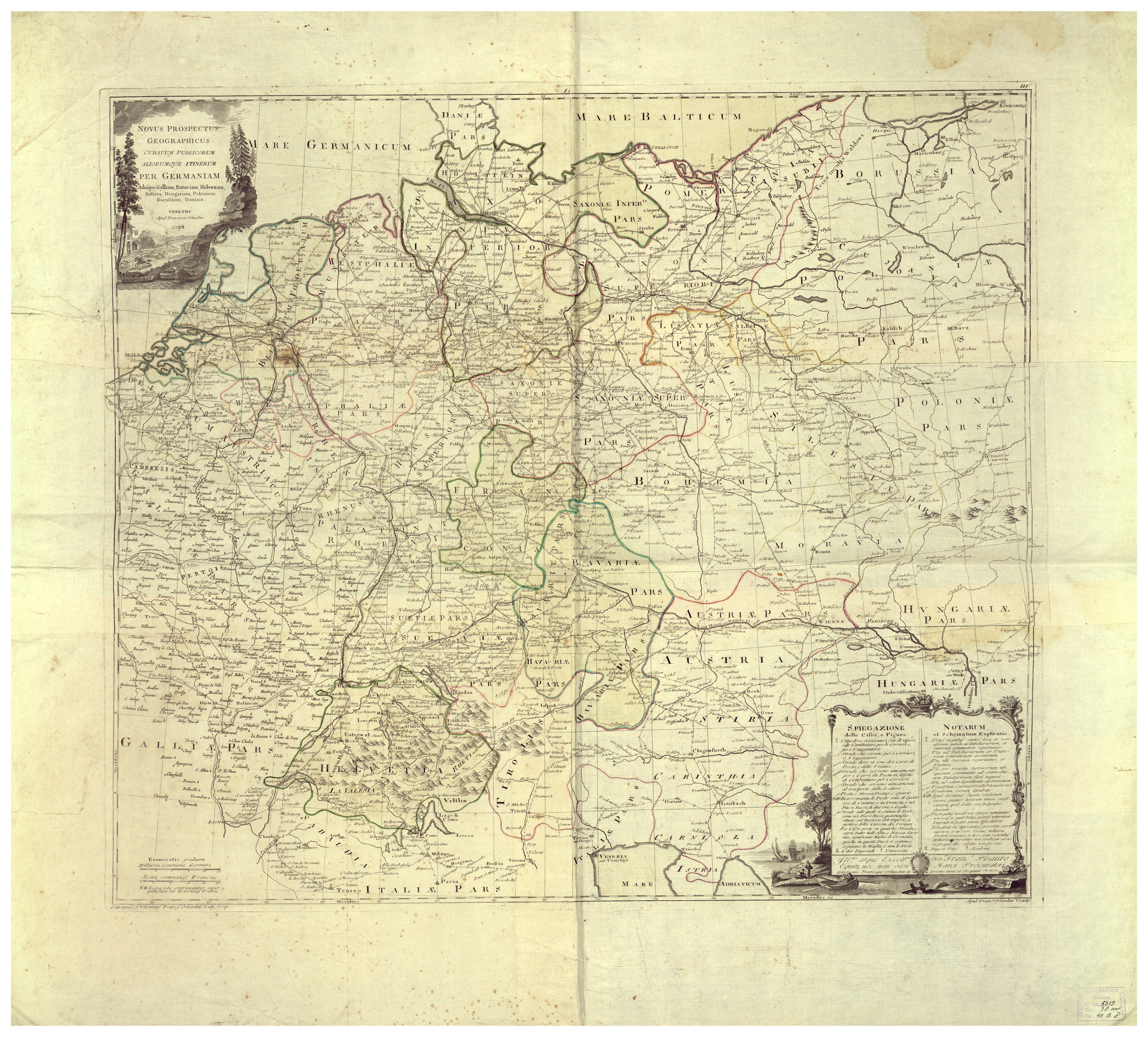 "EUROPA - CARTE GENERALI Autore Francescum Orlandini Fogli 1 incisione su rame colorita a mano rappresentazione orografica prospettica. Inventario SBN 7-6519"