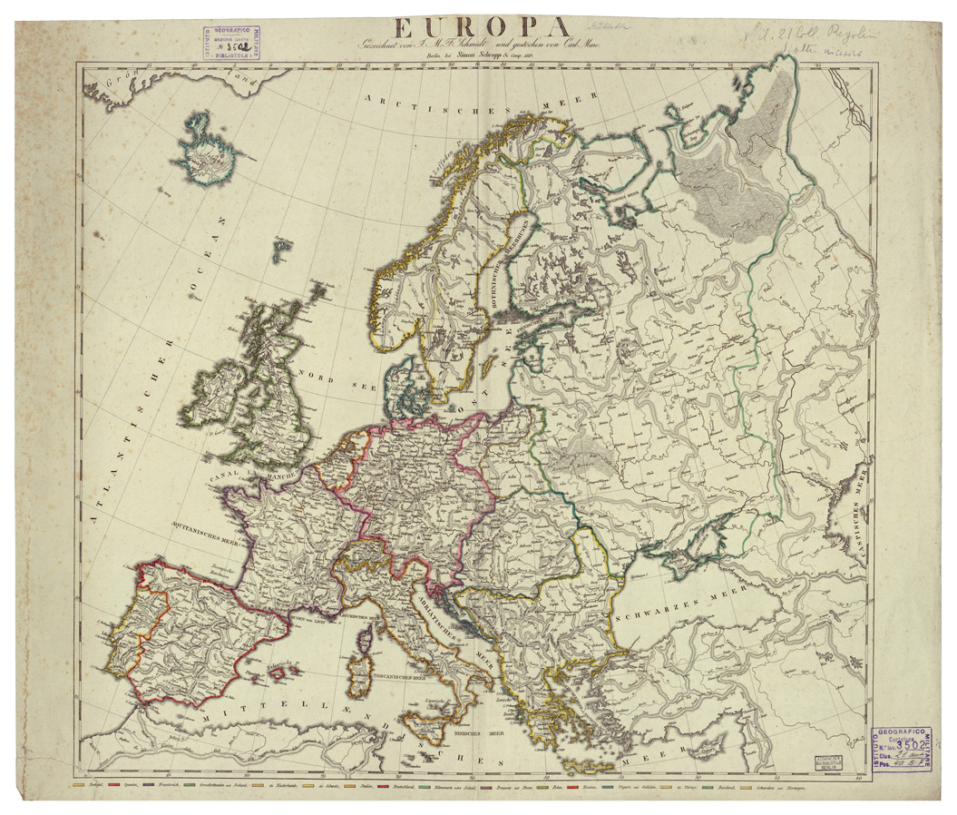 "EUROPA - CARTE GENERALI (senza scala) Autore J.M.F. Schmidt & Carl Mare Fogli 1 Tipo di stampa incisione, rappresentazione orografica a tratteggio dimostrativa. Inventario SBN 7-3502"