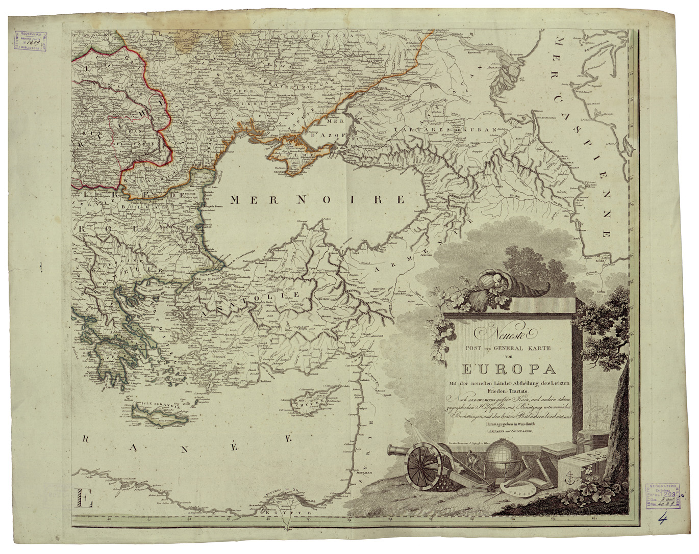 "EUROPA - CARTE GENERALI Autore Artaria & Comp. Fogli 8 (di cui 4 uniti su tela a stacchi) incisione colorita a mano rappresentazione orografica prospettica. Inventario SBN 7-1209 "