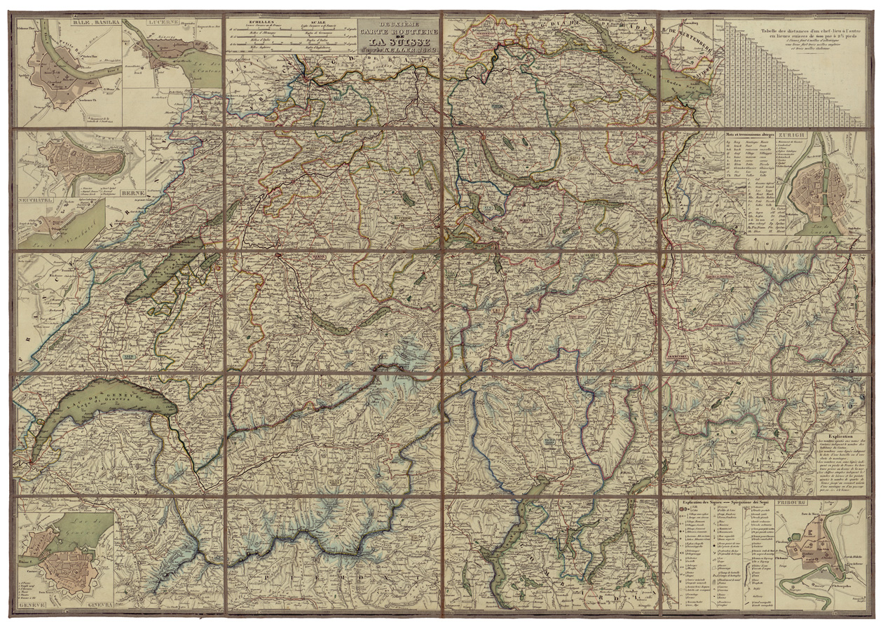 "SVIZZERA Autore Keller Henrich Fogli 1 stampa policroma colorata a mano rappresentazione orografica tratteggio. Inventario SBN 7-365025"
