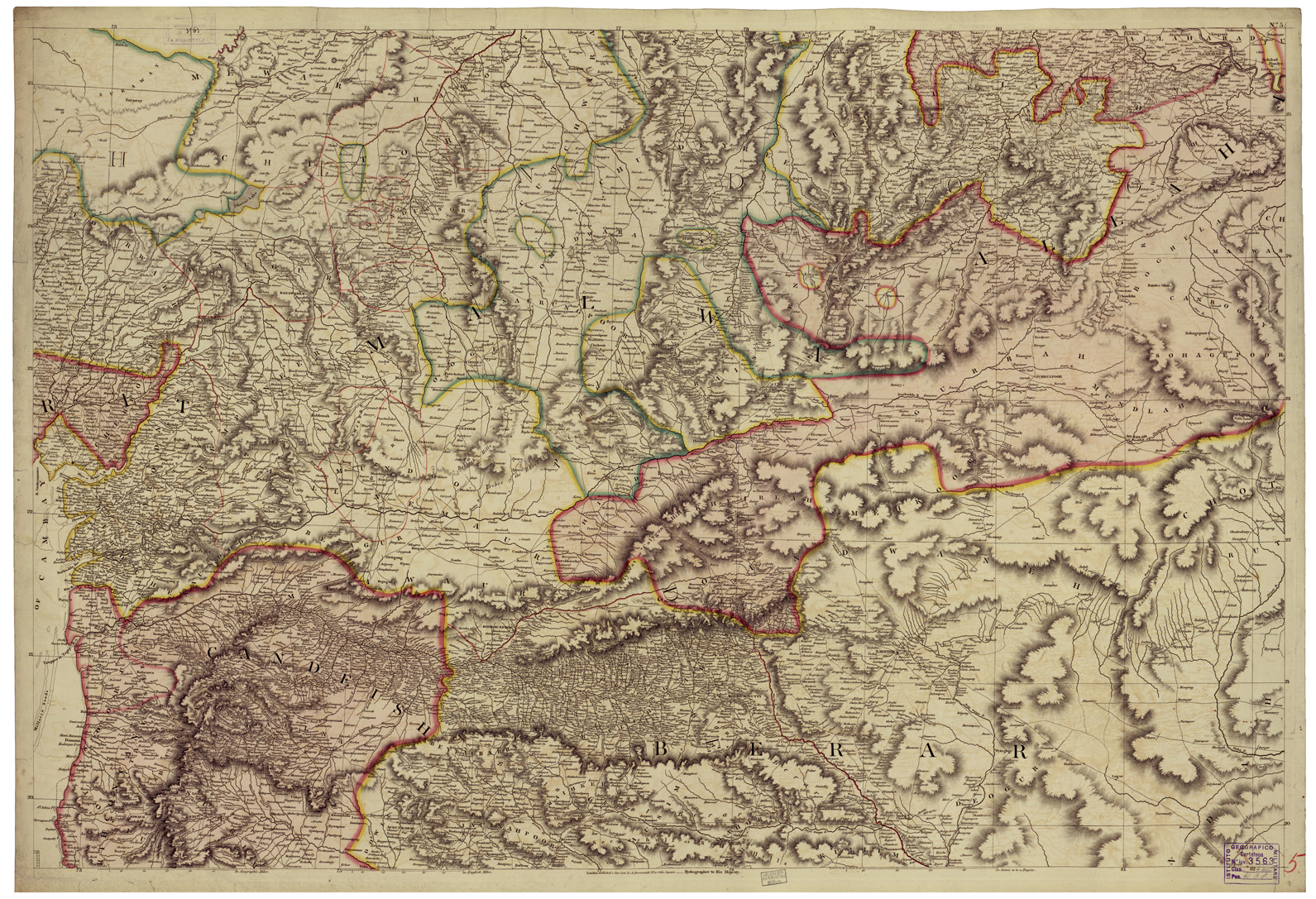"Autore Arronsmith Fogli 10 stampa in nero, coloritura a mano rappresentazione orografica a tratteggio. Inventario SBN 7-3563 "