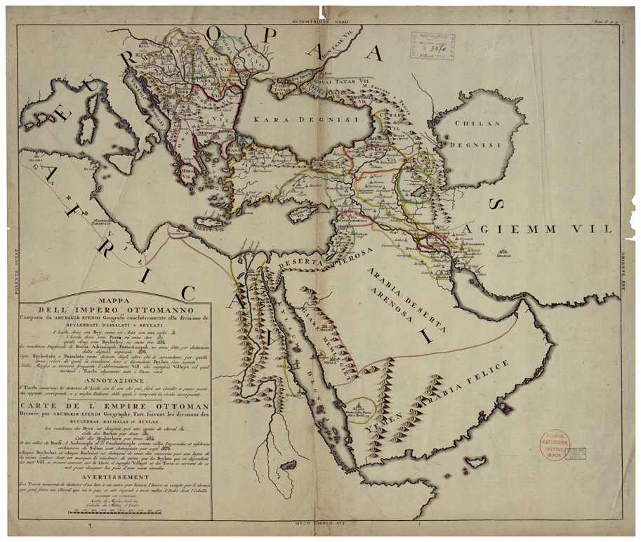 "Autore Abubekir Efendi Fogli 1 stampa in nero, coloritura a mano rappresentazione orografica prospettica. Inventario SBN 7-3570"