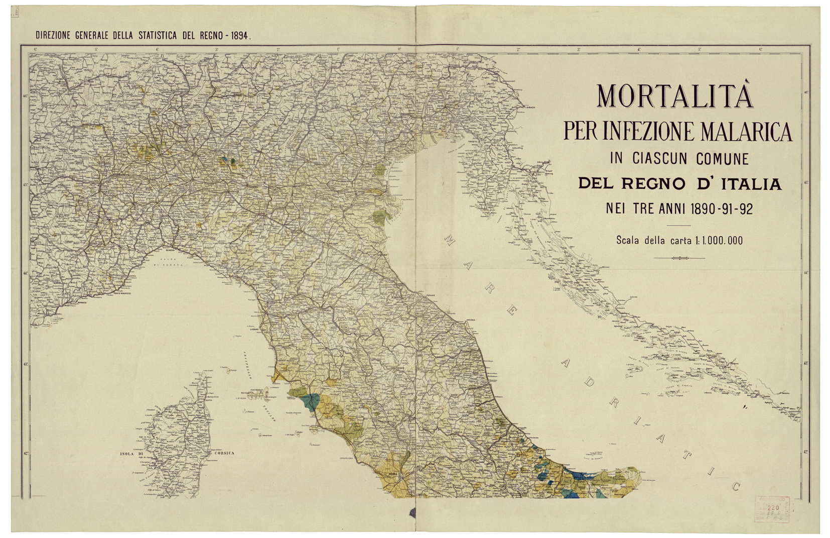 CARTA INDICANTE LA MORTALITA' PER INFEZIONE MALARICA IN CIASCUN COMUNE DEL REGNO D'ITALIA NEGLI ANNI 1890-91-92 - FOGLIO 1