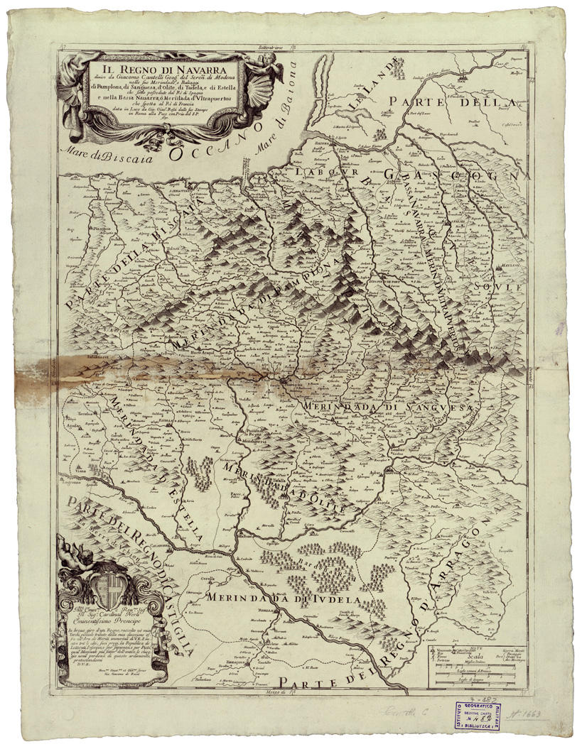 "Autore Giacomo Cantelli da Vignola Fogli 1 stampa in nero incisa su rame rappresentazione orografica prospettica. Inventario SBN 7-482 "