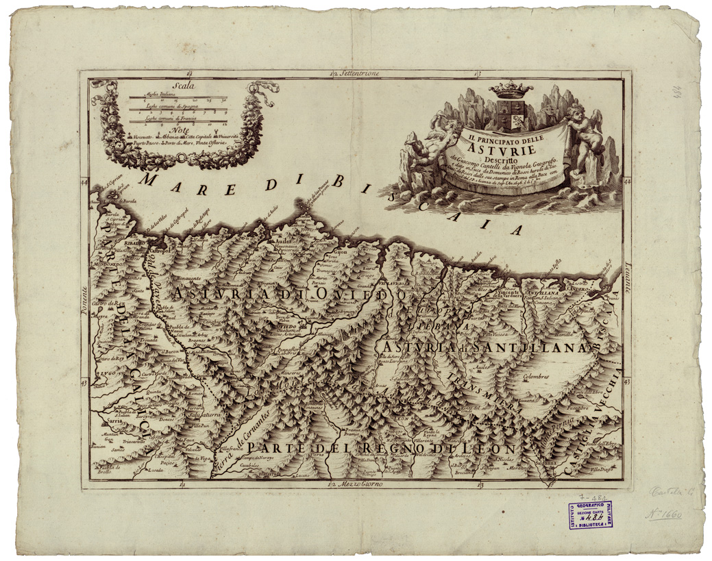 "Autore Giacomo Cantelli da Vignola Fogli 1 stampa in nero incisa su rame rappresentazione orografica prospettica. Inventario SBN 7-484"