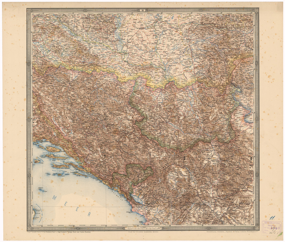 "EUROPA - CARTE GENERALI Autore: Schlacher Fogli 13 - (del foglio VI esiste anche una copia) Stampa policroma, rappresentazione orografica a sfumo, grafia in lingua tedesca. Inventario SBN 7-1191 "