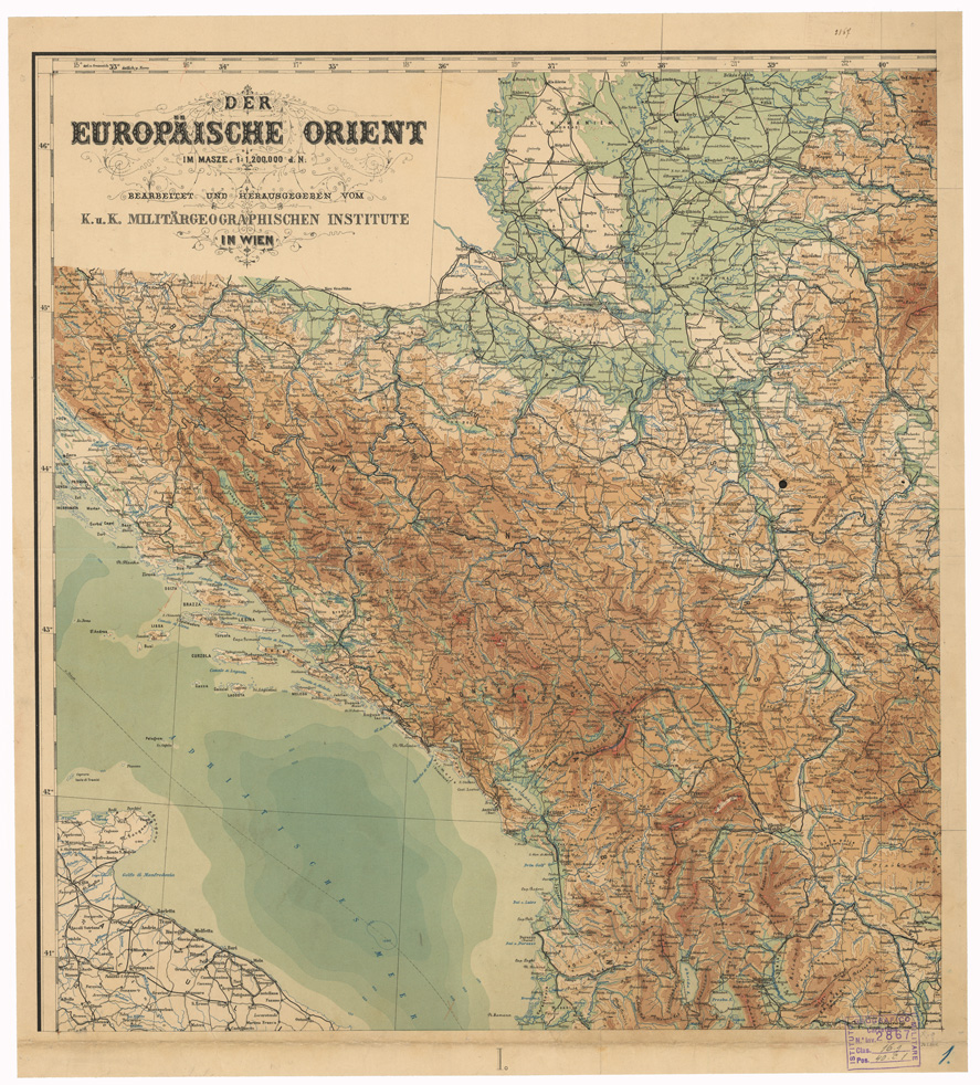 "EUROPA - CARTE GENERALI Autore: Militar Geographisches Inst. Fogli 4 - Rappresentazione orografica a tinte ipsometriche. Inventario SBN 7-2867"
