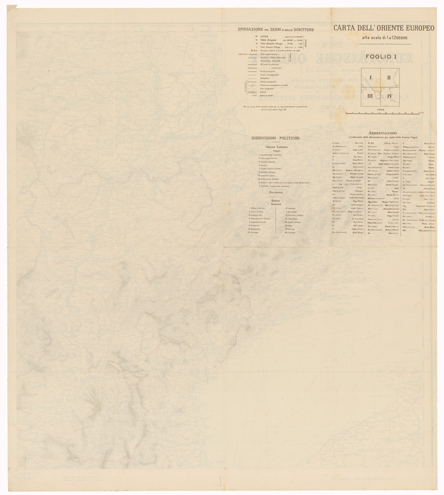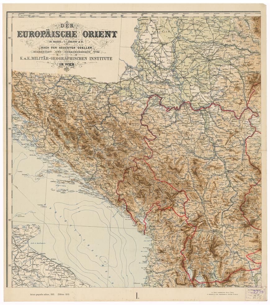 "EUROPA - CARTE GENERALI Autore: Militar Geographischen Institute - ( Istituto Geografico Militare, 1903 ed. 1915) Vienna Fogli 4 - Tipo di stampa policroma rappresentazione orografica a tinte ipsometriche. Inventario SBN 7-2239"