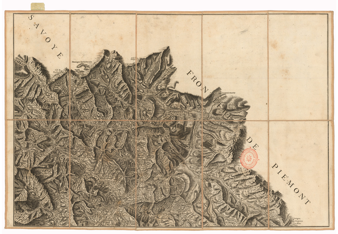 "Fogli 9 su tela a stacchi (esiste una copia su carta) Autore: Mrs. les Ingénieurs ordin. et les Ingén. Géographes de Sa Majesté Tipo di stampa: incisione su rame, rappresentazione orografica a tratteggio. Inventario SBN 7-5823 "