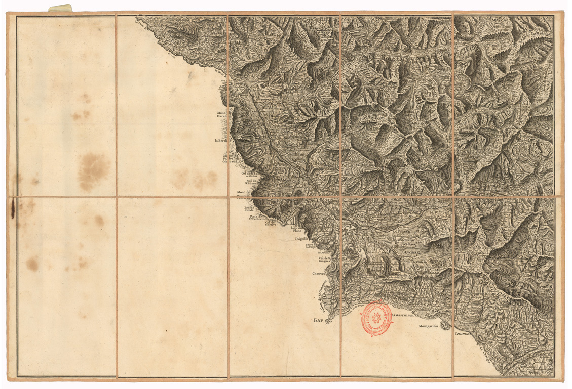 "Fogli 9 su tela a stacchi (esiste una copia su carta) Autore: Mrs. les Ingénieurs ordin. et les Ingén. Géographes de Sa Majesté Tipo di stampa: incisione su rame, rappresentazione orografica a tratteggio. Inventario SBN 7-5823 "