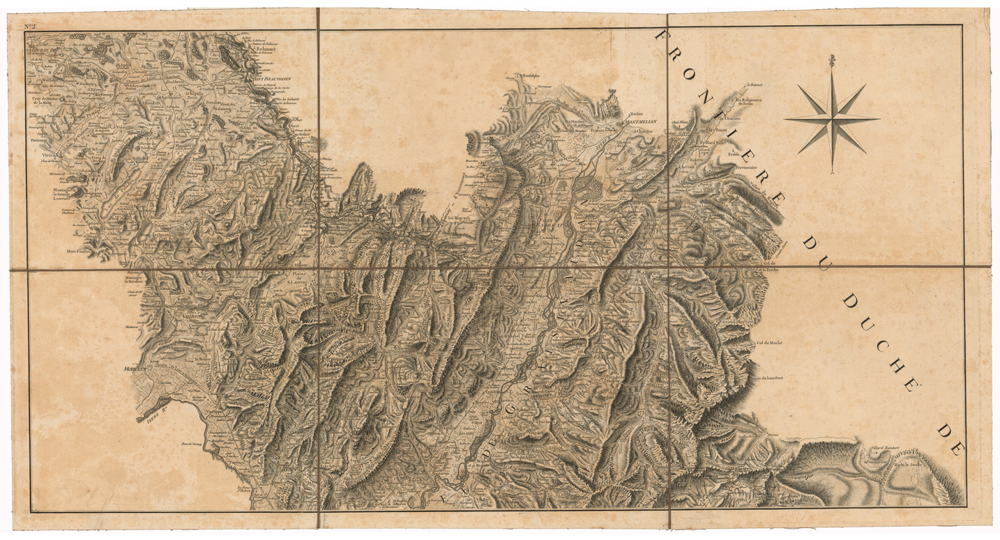 "Fogli 9 su tela a stacchi Autore: Mrs. les Ingénieurs ordin. et les Ingén. Géographes de Sa Majesté Tipo di stampa: incisione su rame, rappresentazione orografica a tratteggio. Inventario SBN 7-5262"