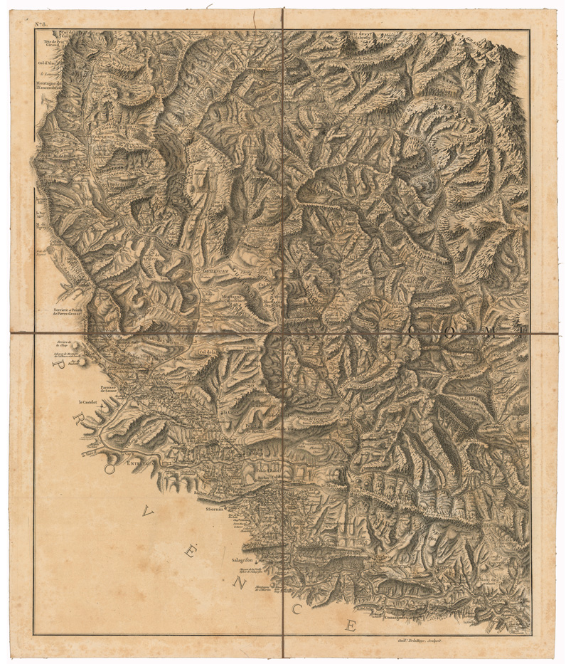 "Fogli 9 su tela a stacchi Autore: Mrs. les Ingénieurs ordin. et les Ingén. Géographes de Sa Majesté Tipo di stampa: incisione su rame, rappresentazione orografica a tratteggio. Inventario SBN 7-5262"