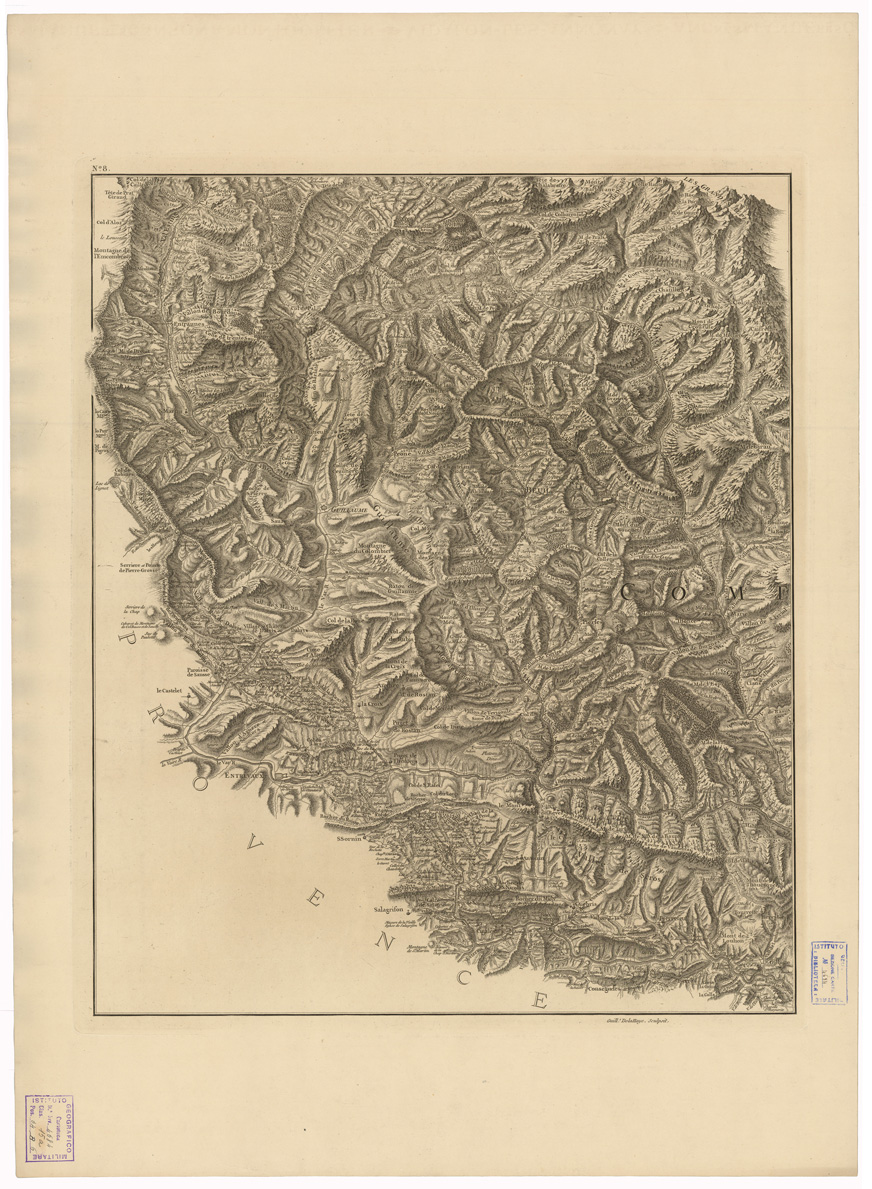 "Autore: Mrs. les Ingénieurs ordin. et les Ingén. Géographes de Sa Majesté Fogli 9 - Tipo di stampa incisione su rame, rappresentazione orografica a tratteggio. Inventario SBN 7-4684"