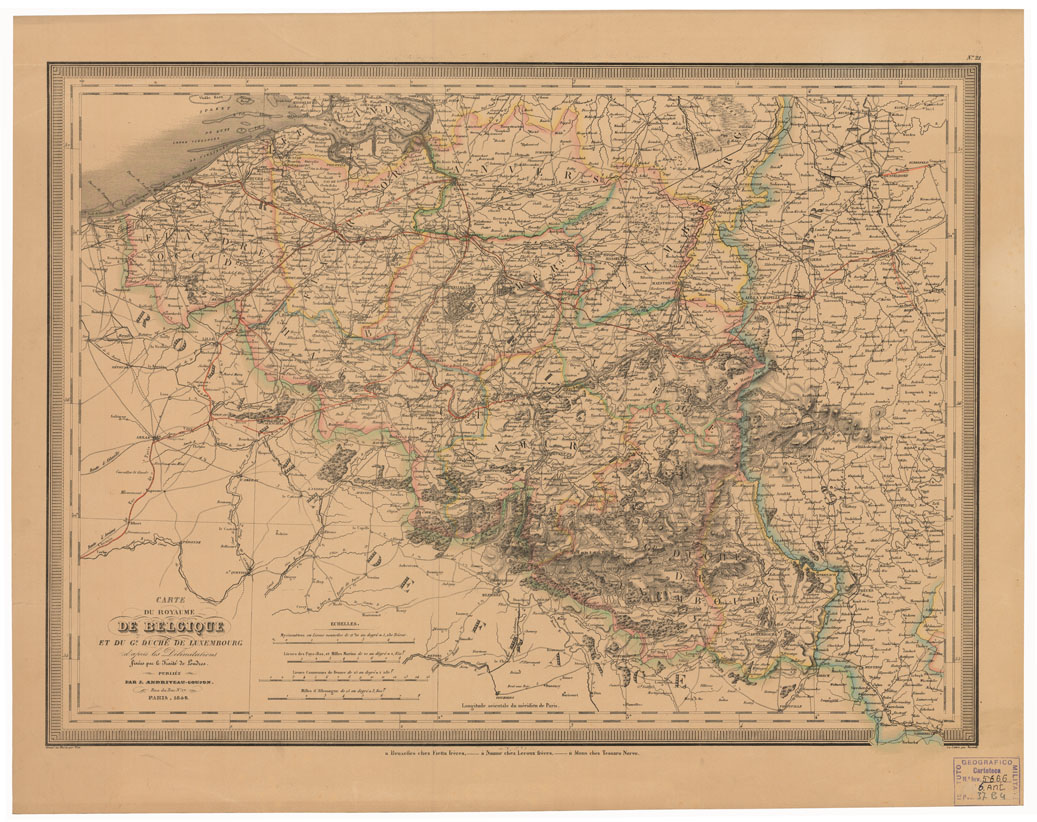 "Autore: Andriveau Goujon Tipo di stampa: in in nero e colori a mano, rappresentazione orografica a tratteggio. Inventario SBN 7-5666 "