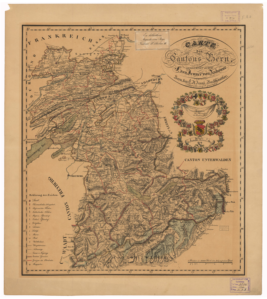 "Autore: Von Jenner von Aubonne Fogli 1 Tipo di stampa: incisione su rame colorata a mano, rappresentazione orografica dimostrativa. Inventario SBN 7-3536"