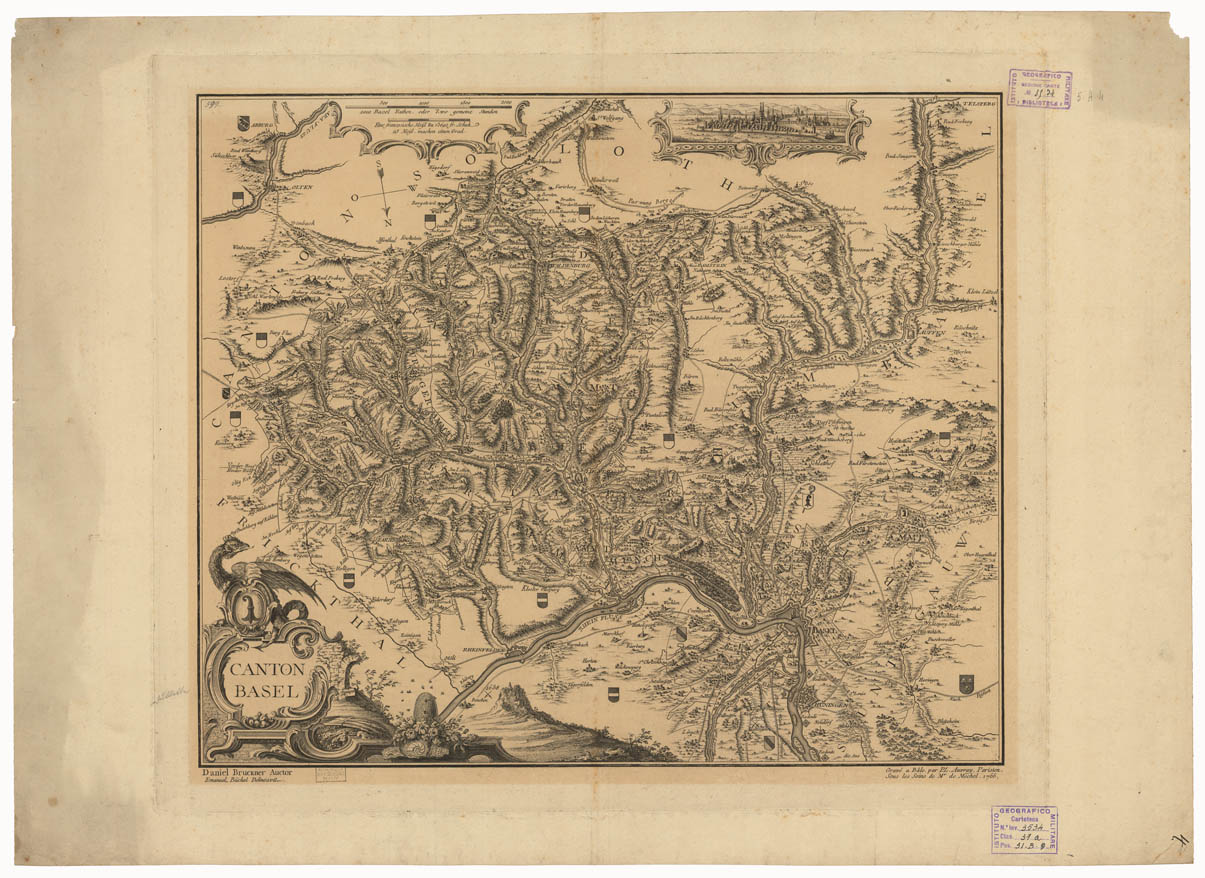 "Autore: Daniel Bruckner Fogli 1 - Tipo di stampa: incisione su rame, rappresentazione orografica dimostrativa. Inventario SBN 7-3534"