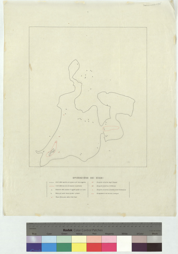 "Autore: Carlo De Stefani rilevò i dati geologici. I.G.M. (FI). Rappresentazione orografica a curve di livello, l'equidistanza fra le curve orizzontali è di 10 metri. In basso la spiegazione dei segni e dei colori. Il documento è formato dalla cara più 2 veline."